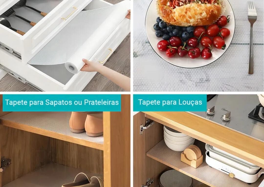 Continue lendoEste forro organizador é perfeito para aplicar em gavetas de armários, forrar bancadas, mesas e prateleiras,trazendo mais higiene e organização