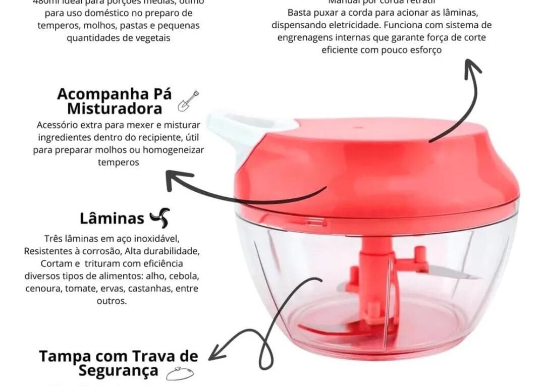 Continue lendoApto para lava-louças, facilitando alimpeza.O Processador e Triturador deAlimentos Manual Premium é aescolha perfeita para quem buscapraticidade, eficiência e segurança