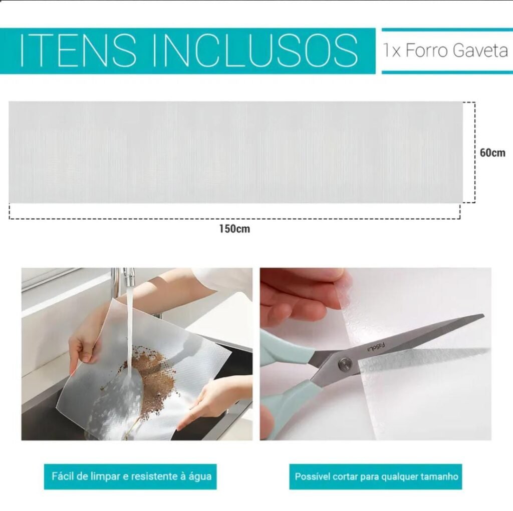 Este forro organizador é perfeito para aplicar em gavetas de armários, forrar bancadas, mesas e prateleiras,trazendo mais higiene e organização para sua casa.Feito de uma mistura Especial de PVC com EVA, este forro é extremamente durável, higienico e simples de limpar.O forro vem no tamanho de150x60cm para você aplicar no que desejar e onde quiser.Características principais. CARACTERÍSTICAS TÉCNICAS:Cor: Transparente material: EVA e PVC Modelo: Forro Organizador Casa Attract Textura: Antiaderente e Lisa. medidas:150cm x 60cm(CXL)Peso: 260g