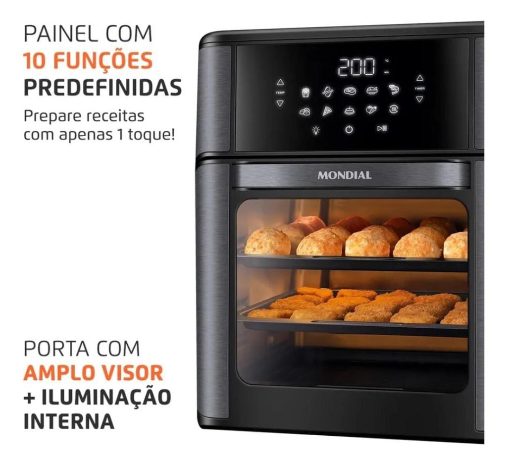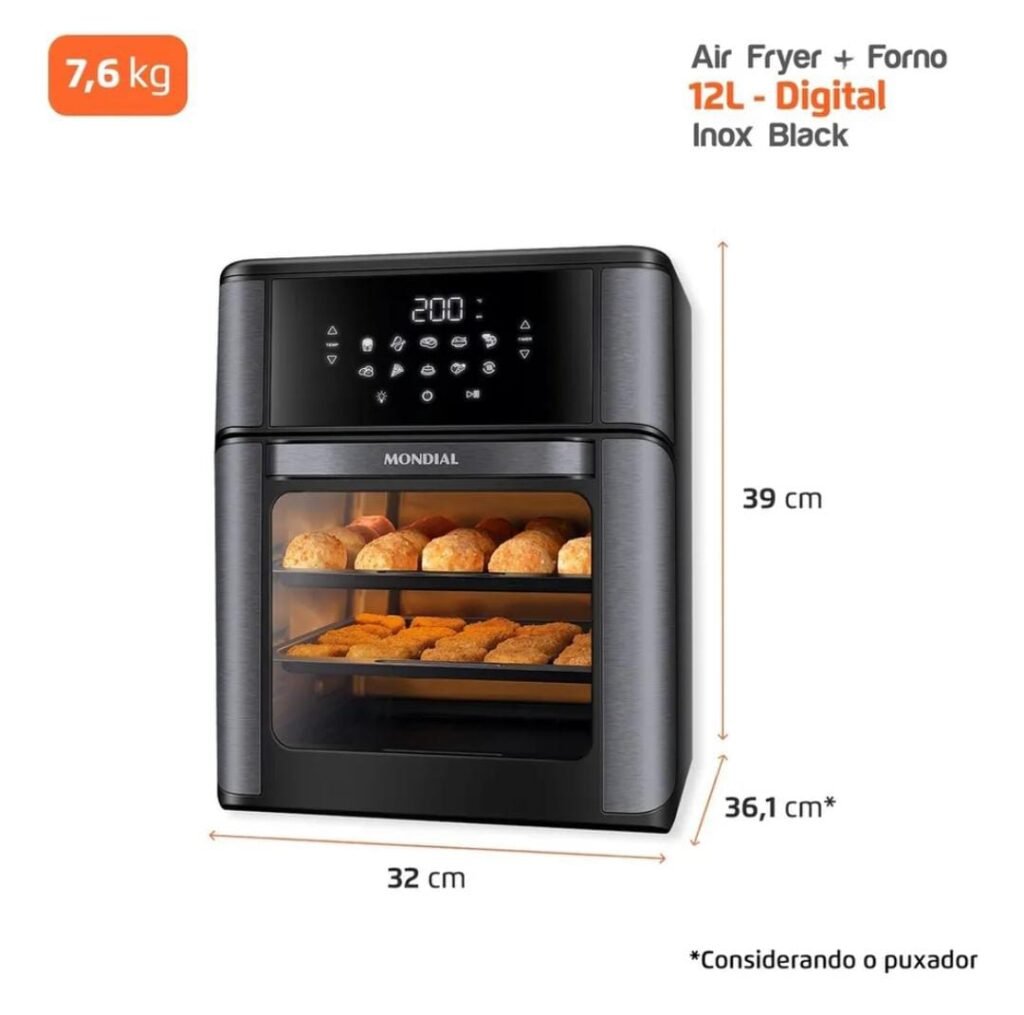 Fritadeira Eletrica Digital Mondial AFON 12L Forno Oven 2 em 1 Air Fryer + Forno – Inox Black Alimentação Mais Saudável