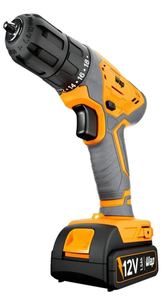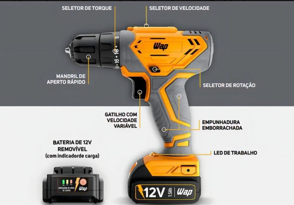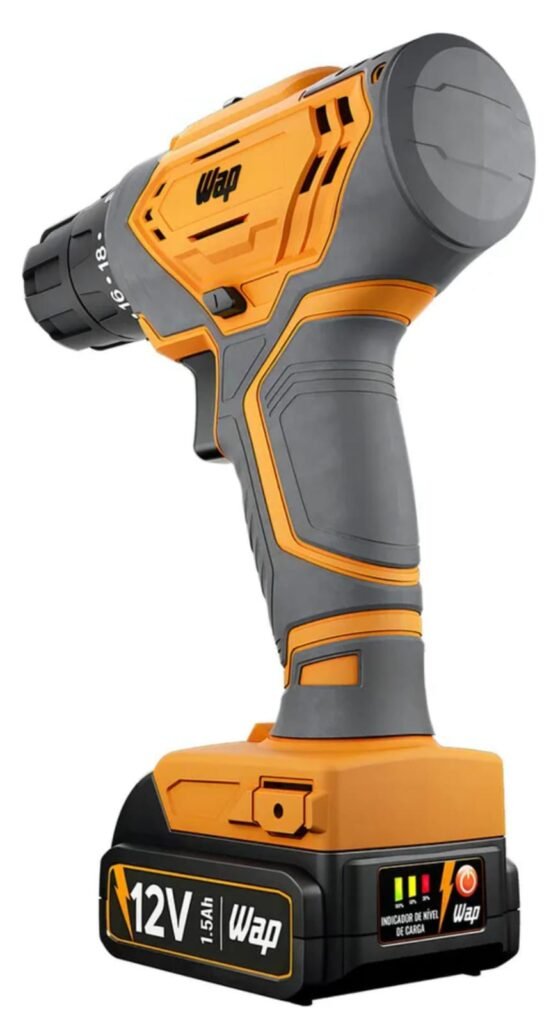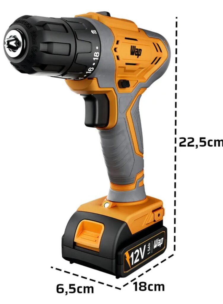 Com função reversa.Vem com maleta de transporte.•Sua frequência é de 60Hz.. Possui função parafusadeira.Velocidade de rotação máxima:1400rpm.Com bateria incluída de Li-ion.• Possui controle de torque.·É de empunhadura do tipo espada.·Possui luz LED.• Dimensões: 6.5cm de largura,22.5cm de altura e 1.8cm deprofundidade.Incluí: 01 Kit 6 Bits Parafusadeira E FURADEIRA 12VWF 12K3.2 COM MALETA E acessórios – Wap DESCRIÇÃO:A Parafusadeira e Furadeira WAP 12VWF 12K3.2 é uma ferramenta versátil e potente, ideal para quem busca precisão e desempenho em projetos de perfuração e parafusamento. Com uma bateria de Li-íon de 1500mAh,ela oferece alta durabilidade e compatível com toda a linha 12V WAP.Seu design ergonômico e funcionalidades avançadas garantem eficiência e conforto em qualquertarefa.VANTAGENS: – Dois níveis de velocidade e controle de intensidade: Permite ajustes personalizados para cada projeto;- Mandril de aperto rápido de 3/8″(10mm): Facilita a troca de acessórios sem necessidade de chave;- Seletor de torque de 18 níveis +1 função de perfuração: Oferece precisão em parafusos e perfurações;- LED de trabalho e indicador de carga: Melhora a visibilidade permite monitorar o tempo de uso;- Empunhadura emborrachada:Proporciona conforto e segurança durante o uso.FICHA TÉCNICA:- Dimensões (CxLxA): 18 x 6,5 × 22,5cm; – Dimensões (CxLxA): 18 x 6,5 x 22,5cm;- Rotação: 0-350 RPM/ O-1400 RPM;- Capacidade da Bateria: 1500 mAh;- Perfuração em Madeira: 012 mm;- Perfuração em Concreto: 06 mm;- Perfuração em Aço: 06 mm;- Tensão da Bateria: 12 V;- Torque Máximo: 25 Nm;- Mandril: 3/8”(10mm);- Peso: 1,06 kg.