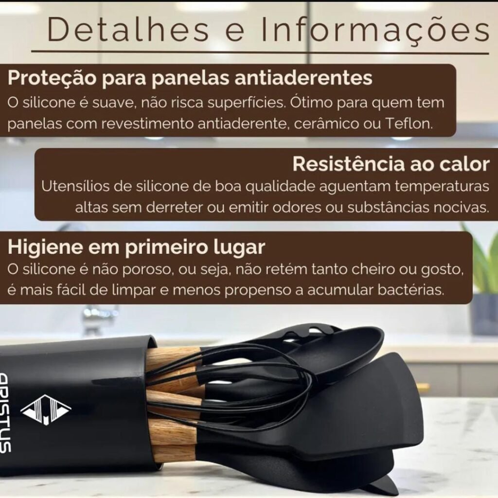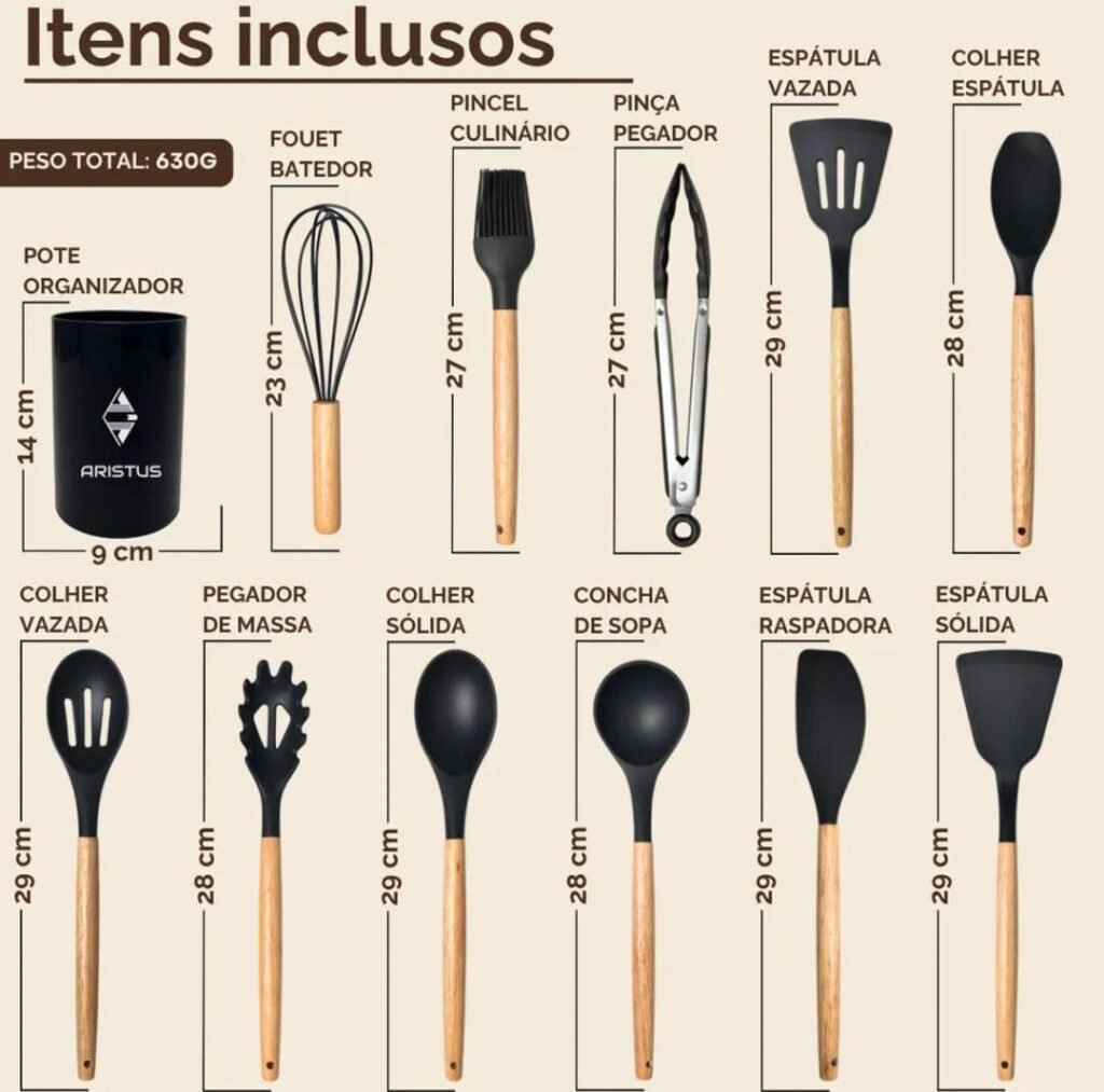 1 Colher Furada. 1 Espátula Raspadora. 1 Colher de Arroz. 1 Suporte ou Copo para armazenamento Destaques do Produto: Silicone de alta qualidade: Resistente a temperaturas de até 230 Graus celsius, não risca panelas e mantém sua forma. Cabos de madeira natural: Elegantes, resistentes ao calor e confortáveis de segurar. não acumula resíduos.
