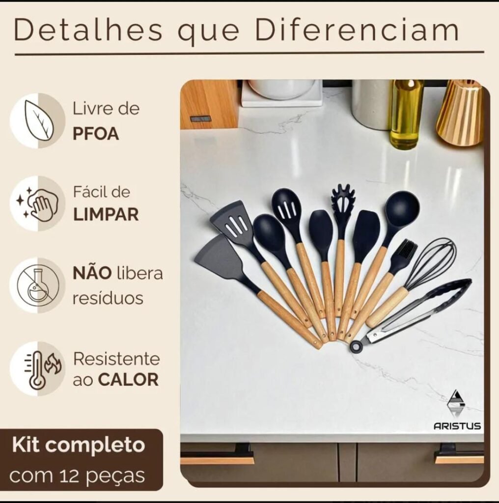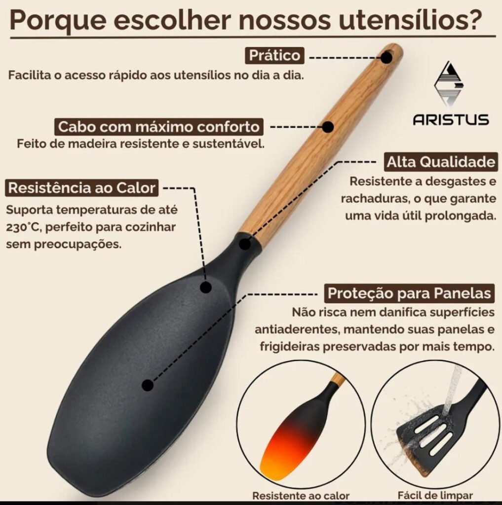 Kit Premium com 12 Utensílios de Cozinha em Silicone com Cabo Resistente em Madeira Aristos Com Resistência ao calor de até 230°c Antiderrapante , Cor Preto, Duráveis e Modernos