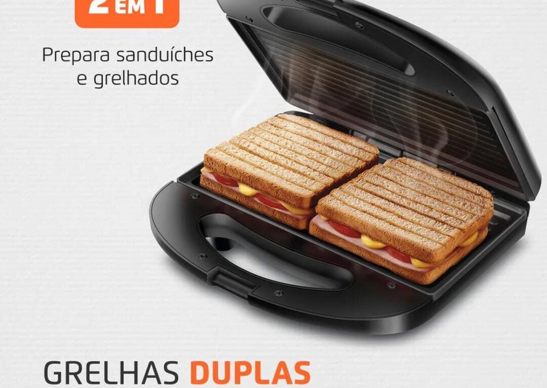 Tem a capacidade de 2 sanduíches.Possui placas para grill.Com alça resistente ao calor.
