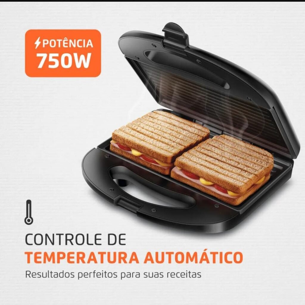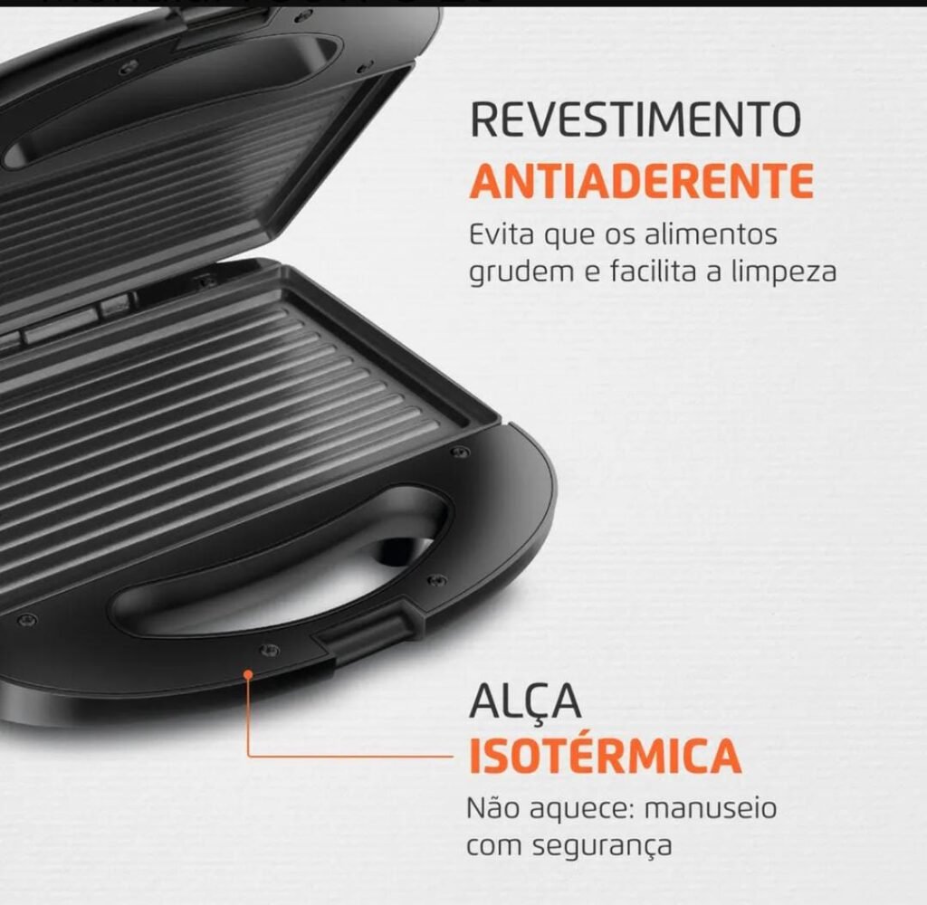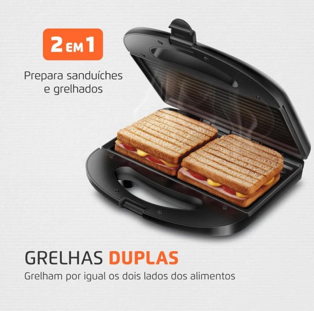 - Tem a capacidade de 2 sanduíches. | Possui placas para grill. | Com alça resistente ao calor. | Dimensões: 21.5cm de lar…
